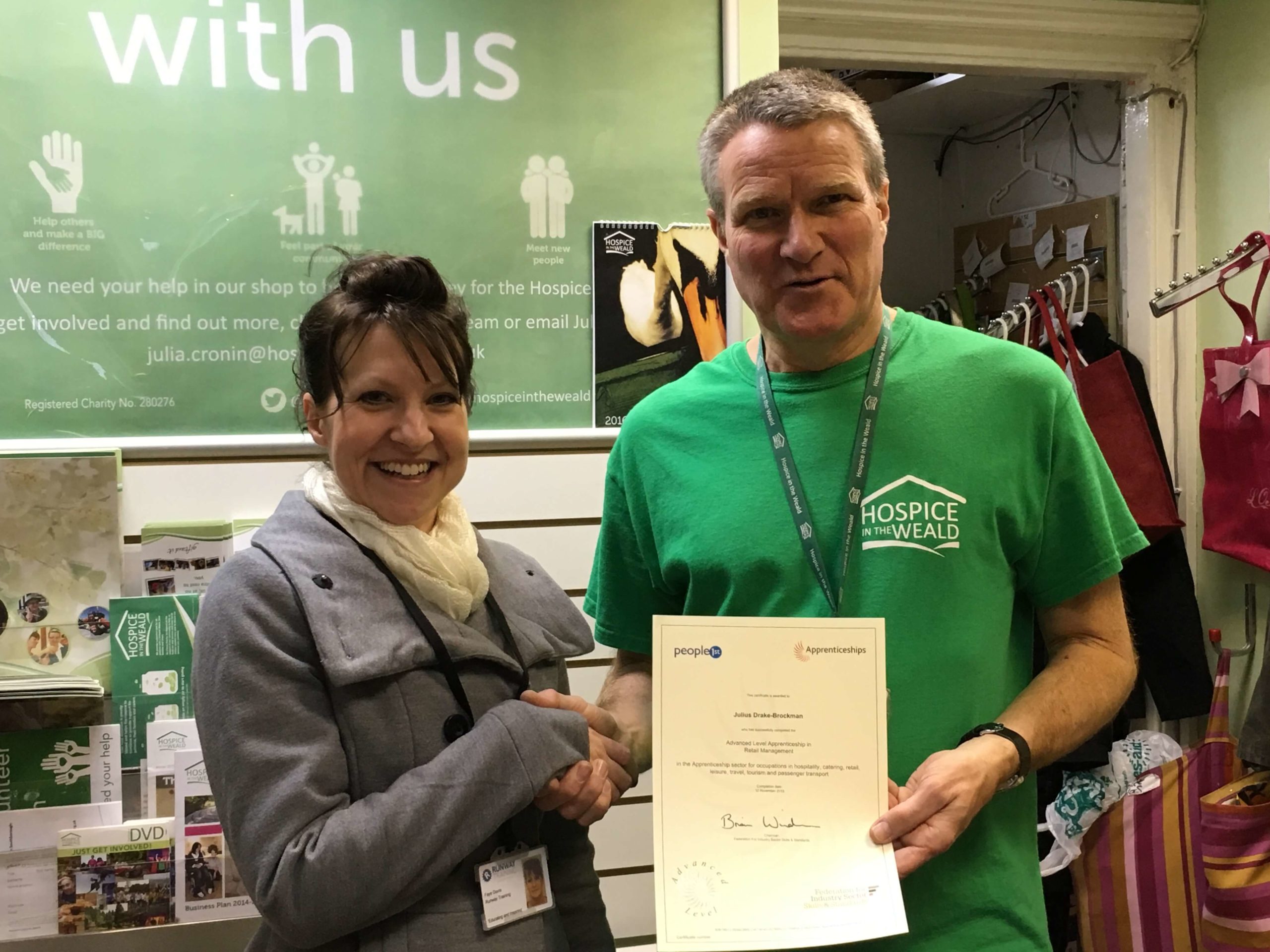 Last year Julius Brockman, Store Manager of the Southborough Hospice in The Weald shop embarked on a Retail Management Level 3 qualification with Runway Training. 15 months on and it was fantastic for Oliver Trailor, Managing Director of Runway Training and Faye Davis who assessed Julius, to visit his shop and present him with his certificate. Julius was delighted with the visit and said that he had “learned a great deal from the qualification which he had been able to put in to practice, having a really positive effect on the shop”.